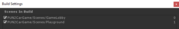 - Voeg zowel GameLobby- als Speeltuinscènes toe aan de Build-instellingen: