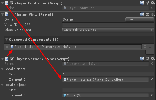 }- Voeg het PlayerNetworkSync.cs-script toe aan de PlayerInstance en wijs het toe aan de PhotonView Observed Components.