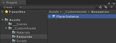 - Sla de PlayerInstance op in Prefab en verplaats deze naar de map met de naam Resources (als zo'n map niet bestaat, maak er dan een). Deze stap is nodig om multiplayer-objecten via het netwerk te kunnen spawnen.