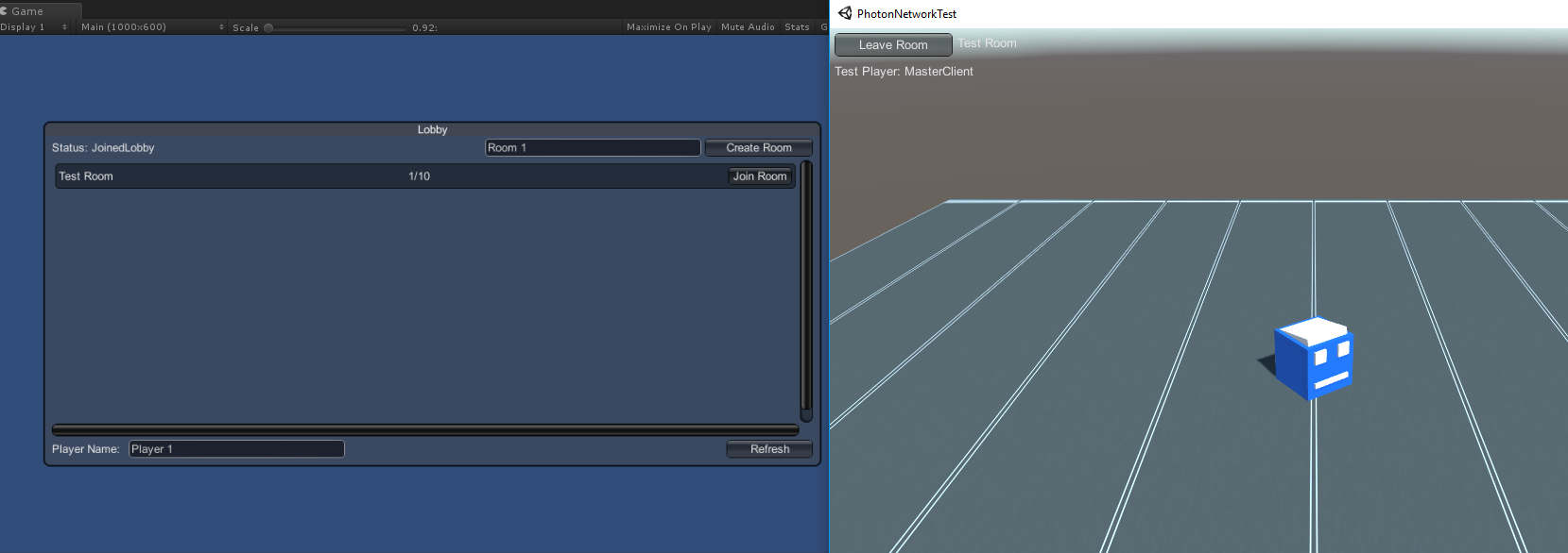 }En een eenvoudige gebruikersinterface met een knop "Leave Room" en enkele extra elementen, zoals de naam van de kamer en de lijst met verbonden spelers:
