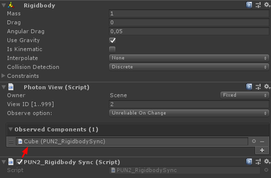 }- Koppel PUN2_RigidbodySync aan beide kubussen en wijs deze ook toe aan Photon View "Observed Components":