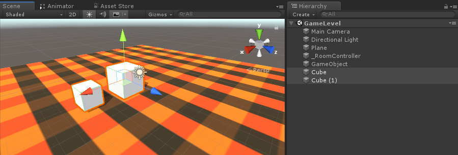 - Open de scène "GameLevel" en maak een paar kubussen (GameObject -> 3D-object -> Kubus)