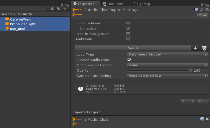 In mijn project heb ik bijvoorbeeld 3 geluiden met verschillende doeleinden, en zoals je kunt zien, hebben ze allemaal standaard importinstellingen die niet geschikt zijn voor elk geluidstype.