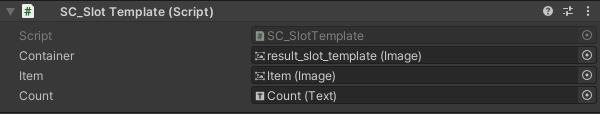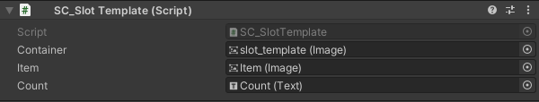 - Voeg het SC_SlotTemplate-script toe aan het "slot_template"-object en wijs de variabelen ervan toe (de afbeeldingscomponent op hetzelfde object gaat naar de "Container"-variabele, de onderliggende "Item"-afbeelding gaat naar de "Item"-variabele en een onderliggende "Count" Tekst gaat naar "Count" variabele)