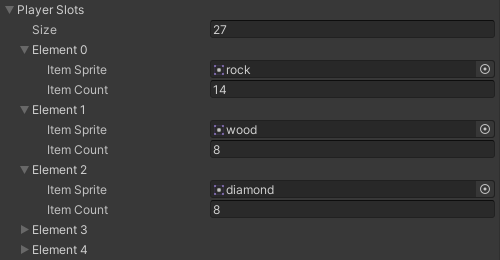Om een item aan elk slot toe te voegen, moeten we een item Sprite toewijzen aan de "Item Sprite" variabele en de "Item Count" instellen op een positief getal (alles onder 1 en/of niet-stapelbare items worden geïnterpreteerd als 1):