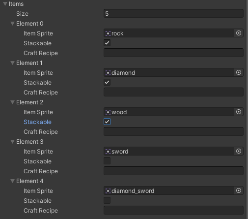 "Stackable" variabele bepaalt of de items in één gleuf kunnen worden gestapeld (u wilt bijvoorbeeld misschien alleen stapelen toestaan voor eenvoudige materialen zoals steen, diamant en hout).
