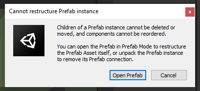 - Sommige acties worden niet ondersteund bij het rechtstreeks in de scène bewerken van Prefab. Als u bijvoorbeeld de hiërarchie moet herstructureren, krijgt u het bericht "Cannot restructure Prefab instance" te zien en opties voor "Open Prefab" of "Cancel".